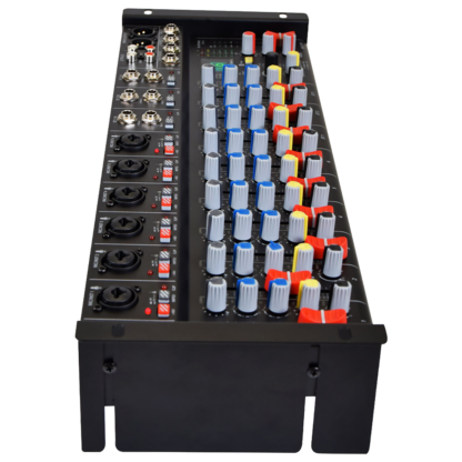 The Citronic CSR-63 rack-mountable mixing console is built to offer full-size mixer features in a slim profile format. Equipped with 6 mic/line channels and 3 stereo line channels, each has individual Gain, 2-band EQ, FX and PAN control with a 60mm Level fader. Mono channels also have individually switchable +48V phantom power and can accept a mic, line or instrument input. For live performers, a DSP effects section has 16 editable presets and can be activated remotely via a foot switch if needed. Balanced main outputs are joined by 2-track in and out, monitor out, headphones out and a Bluetooth receiver for wireless music playback. Uniquely designed end panels are supplied to enable installation into a 19″ rack or left off for free-standing operation. When rack-mounted, the CSR-63 occupies a little less than 4U height, allowing space to feed cables through the rear of the rack frame from the top-mounted connectors. The end panels also have adjustable depth fixing, enabling controls to stand proud of the rack for easy access or deeper behind the frame for protection. Unlike most rack mixers, this mixer has a shallow housing depth to allow back-to-back mounting with other equipment in racks with rear mounting strips. Overall, the CSR-63 can find its home in numerous different audio setups and provides a problem-solver for both installed and mobile PA systems.