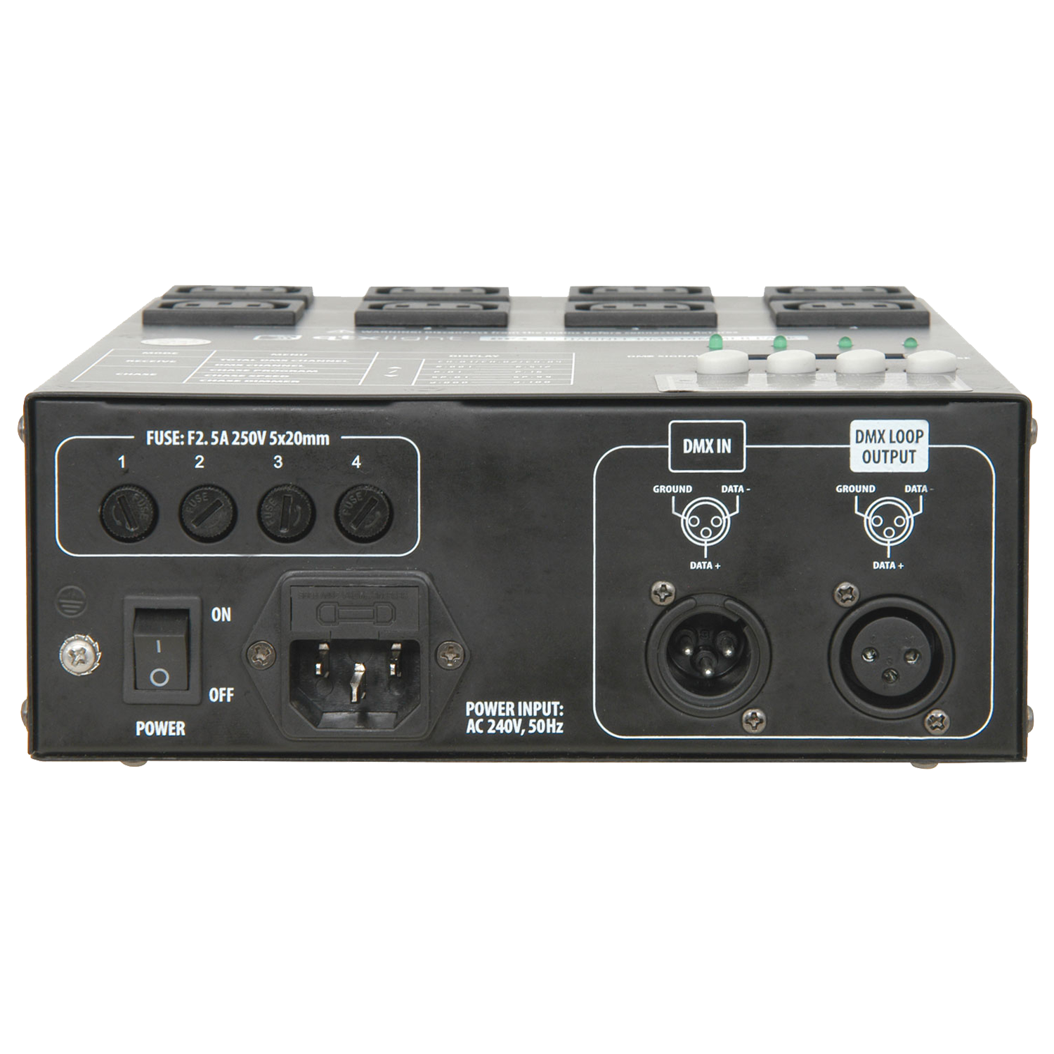 The DP4 4 channel DMX dimmer pack has 4 channels each with 2 IEC power outputs per channel. It has 16 built-in chase programs or can be controlled by 4 channel DMX.